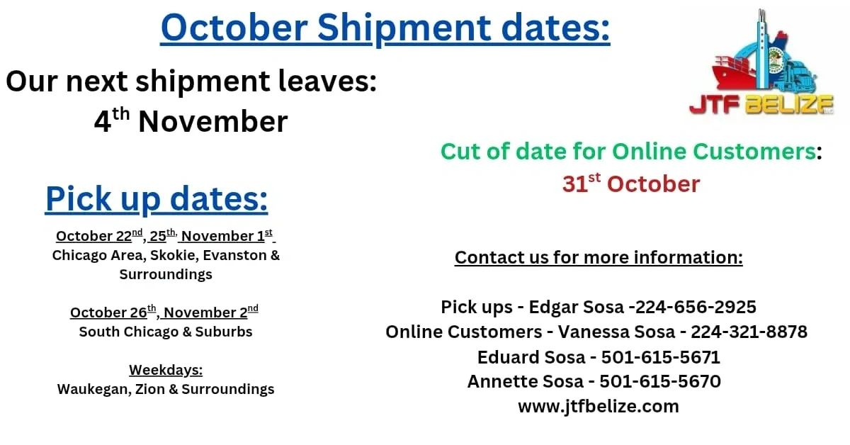 JTF BELIZE LLC is committed in providing monthly shipments to Belize and our Agents are ready to answer any questions. Feel free to contact us!